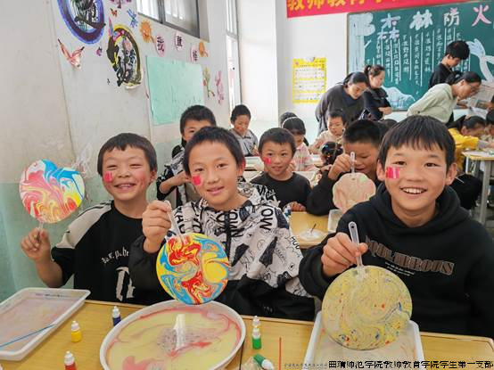 非遗水拓润童心,轻盈纸扇水助成长。水面作花,纸拓成画。56名留守儿童在在师生党员的指导下,用心去感受,动手去探索、去体验,以画签为笔,水面作纸,描绘出属于自己独特的图形,覆上纸扇,慢慢地图案跃然扇上,充满绚丽色彩的画面和孩子们的欢声笑语被定格在扇面上。引导小学生在欢乐的体验中,亲近非遗、感受非遗,领略非遗文化的独特魅力,传承水拓画手工艺术,让非遗文化之美浸润童心。
