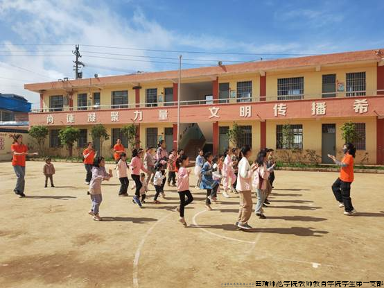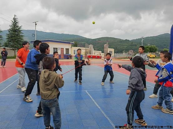 趣味游戏  伴“童”成长。实践团师生党员组织光头村、野猪村、钢厂村86名留守儿童开展体育、舞蹈教育浸润活动。体育游戏《同心鼓》的鼓点铿锵有力,彰显出团队协作的默契与力量,鼓声激荡中,心也紧紧连在一起;《穿针引线》《小螃蟹赛跑》、《踩气球》、《大风吹》等游戏更是让孩子们尽情释放天性,加深彼此之间的情感交流。舞蹈教学《勇气大爆发》、歌曲教学《向上吧少年》将整个现场推向了高潮,孩子们的欢声笑语响彻校园,如同悠扬的音乐编织出一幅充满生机与活力的教育图景。