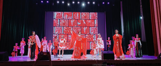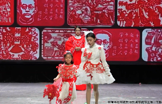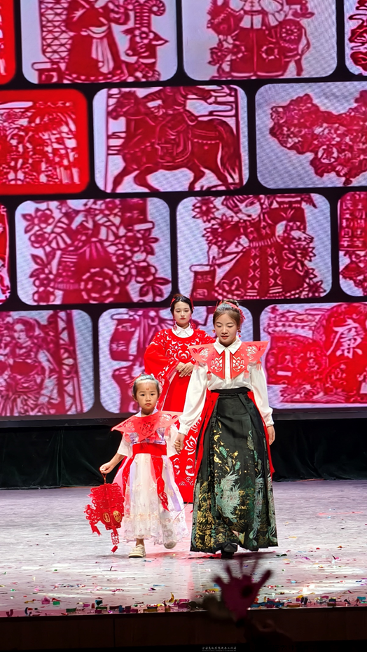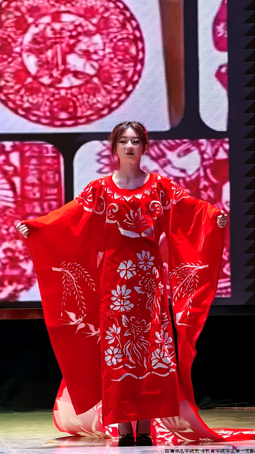 伴随着悠扬典雅的音乐,身着剪纸华服的学生款步上台,瞬间成为全场焦点。水袖轻扬时,衣袂间光影交错,仿佛一幅幅动态剪纸在舞台上徐徐展开,光影交错间,那些细腻的镂空、精巧的线条仿佛都跳动起来,演绎着无声却震撼人心的文化故事。台下观众仿若穿越时空隧道,既领略到传统剪纸艺术的精妙绝伦,又感受到时尚走秀带来的现代美感,古今交融,让人沉醉其中,掌声雷动。