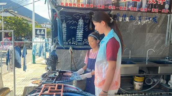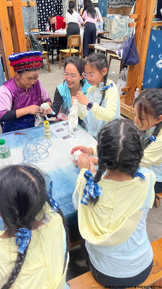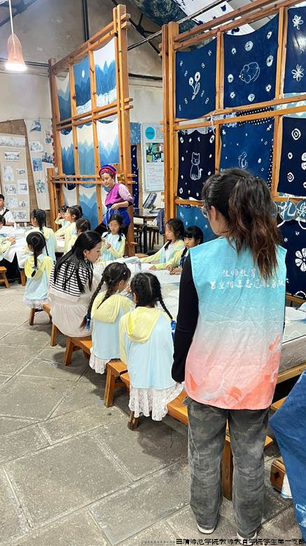 在大理喜洲镇周城村,实践团队开启非遗扎染文化守护之旅。队员们跟随非遗传承人系统学习扎染技艺,从靛蓝染缸的调配到板结技法的掌握,从图案设计的构思到成品晾晒的工序,全程沉浸式体验这项千年技艺的魅力。为推动非遗活态传承,团队创新开展“非遗课堂进校园”活动,将扎染工艺与美育课程有机结合,指导小学生创作出融合现代审美的传统作品。一幅幅蓝白相间的布艺画作,不仅承载着民族文化记忆,更在年轻一代心中播撒下文化自信的种子。