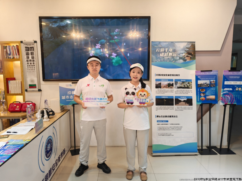 在青龙湖射箭场馆中心,吉豪(2023级大数据与会计4班)、杨焜(2023级会计学1班)等学生志愿者作为场馆观众信息咨询助理,帮助观众答疑解惑,时刻关注观众观赛状态,提供物品寄存、失物招领等服务。在吾悦广场书房地铁站D口城市志愿服务小站,张远扬(2023级大数据与会计3班)、高凤娜(2023级大数据与会计10班)、冯芹(2024级大数据与会计4班)等学生志愿者坚守城市服务一线,承担场馆指引、秩序维护、游客咨询等工作,并发放世运会宣传单,向更多人宣传赛事咨询。在南桥社区党群服务中心志愿服务小站,唐进等教师志愿者除了提供世运赛会讯息咨询、城市宣传、便民服务之外,还用VR技术向市民呈现中华传统体育和文化魅力,用科技让千年文化触手可及。