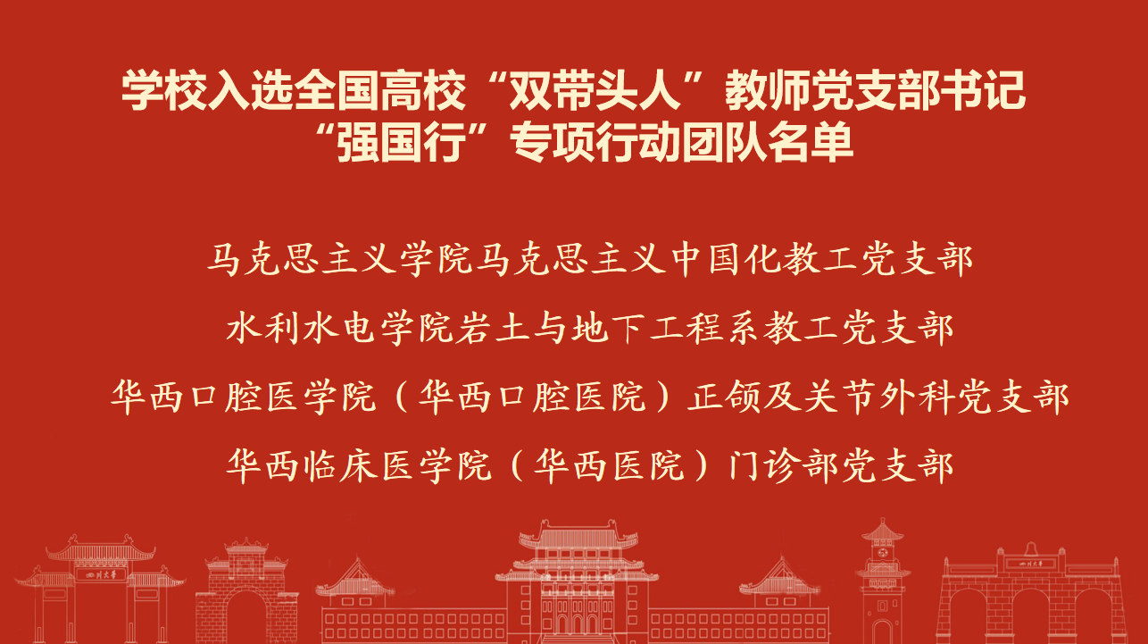 近日,教育部办公厅印发了《关于公布全国高校“双带头人”教师党支部书记“强国行”专项行动团队名单的通知》,我校马克思主义学院马克思主义中国化教工党支部、水利水电学院岩土与地下工程系教工党支部、华西口腔医学院(华西口腔医院)正颌及关节外科党支部、华西临床医学院(华西医院)门诊部党支部入选。