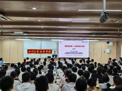 2024年9月8日,在江安校区综合楼C207,王玉忠院士为化学学院2024级本科生带来了新生入学教育讲座——勤奋加拼搏,让优秀成为习惯。学院党委副书记肖波、2024级本科生辅导员侯鹏飞及2024级全体本科生参加了此次讲座。