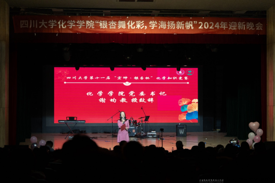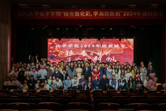 为帮助2024级新生尽快融入大学生活,展示新时代青年风貌,加强美育教育,引导学生团结合作、积极向上,四川大学化学学院“银杏舞化彩,学海扬新帆”2024年迎新晚会暨化学学科系列竞赛颁奖典礼于2024年12月1日晚19:00在江安校区艺术学院小剧场顺利举行。四川大学化学学院党委书记谢均教授、党委副书记肖波老师、王玉良教授、郑保战教授、教导员王毅老师、学院全体辅导员、获奖选手及化学学院2024级全体同学参加了本次活动。