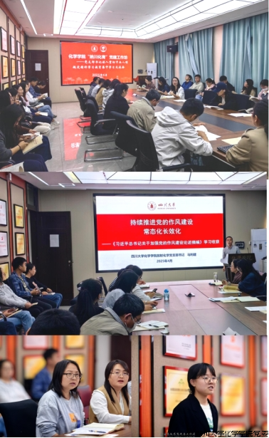 四川大学化学学院无机分析党支部书记张立春、行政仪器中心党支部书记姜林、22级博士一支部支委张巧,从教师党支部、教职工党支部、学生党支部角度交流了开展深入贯彻中央八项规定精神学习教育的情况和心得体会。