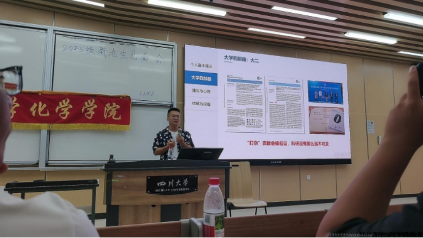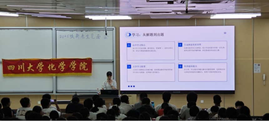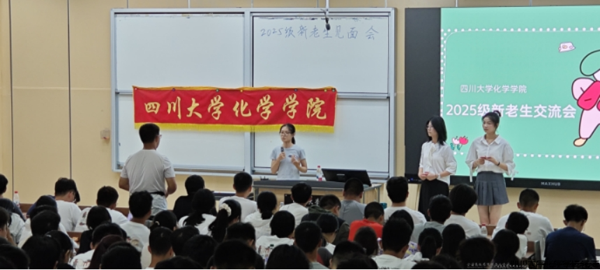 9月9日下午,四川大学化学学院2025级新老生见面会在江安校区综合楼C307顺利举行。此次见面会由四川大学化学学院团委学生会学习部主办,化学学院本科、博士研究生优秀学生代表与2025级本科生辅导员张美成老师应邀出席,化学学院本科2025级全体同学参加了本次见面会。