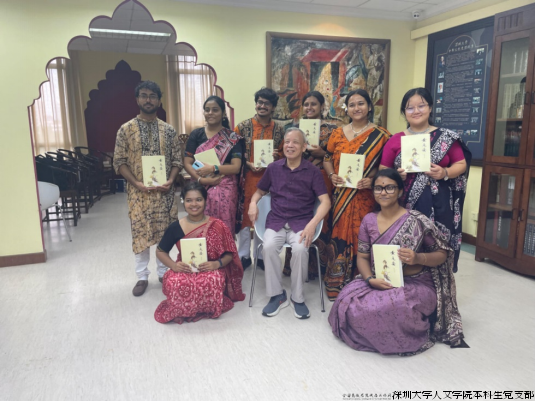 (郁龙余教授向印度大学生赠阅小说《黄道婆》和郁秀的新著《故事,在印度》,鼓励印度学生书写《故事,在中国》,续写梵典与华章新篇章。)