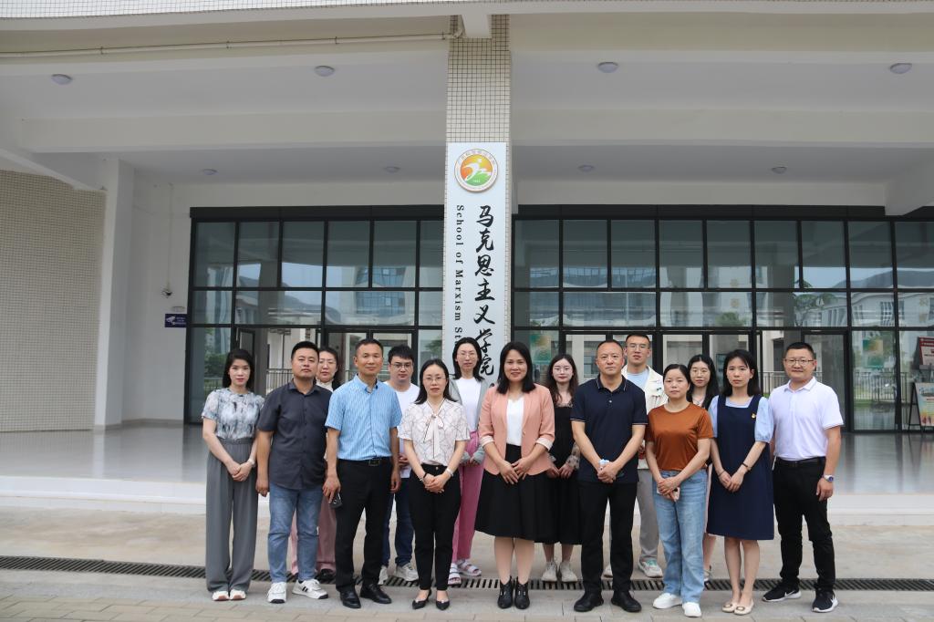 5月16日上午,赴广东科贸职业学院马克思主义学院交流学习。广东科贸职业学院党委副书记、校长王海林,党委副书记方秀英、马克思主义学院院长李琳热情接待。王海林校长介绍了学校的办学历史、招生规模、专业建设及人才培养情况。李琳院长以“新时代创领型湾区马院建设探索”为主题,对马院的建设情况与发展规划进行详细介绍。会后,参观了马院中华优秀传统文化传承基地、广东省党史研习基地、思想政治教育实践实训教学基地、红色直播演播室。