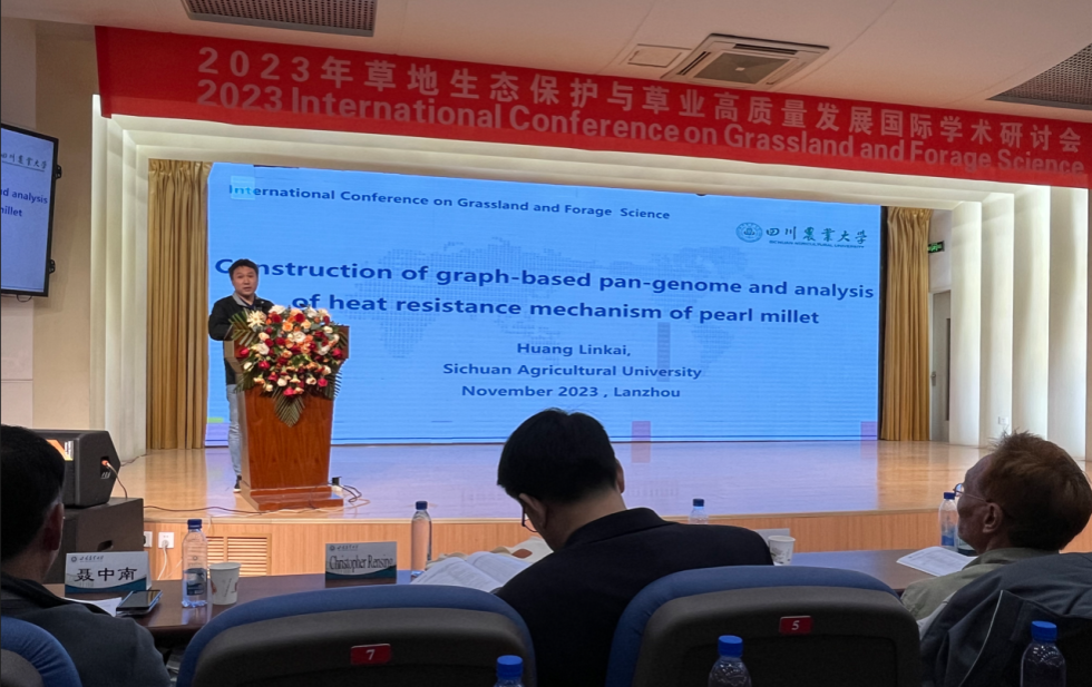 黄琳凯教授作了题为“Construction of graph-based pan-genome and analysis of heat resistance mechanism of pearl millet(美洲狼尾草图形泛基因组构建及耐热机制解析)”大会英文报告,介绍了团队在美洲狼尾草泛基因组构建及耐热机制解析方面取得的重要进展。