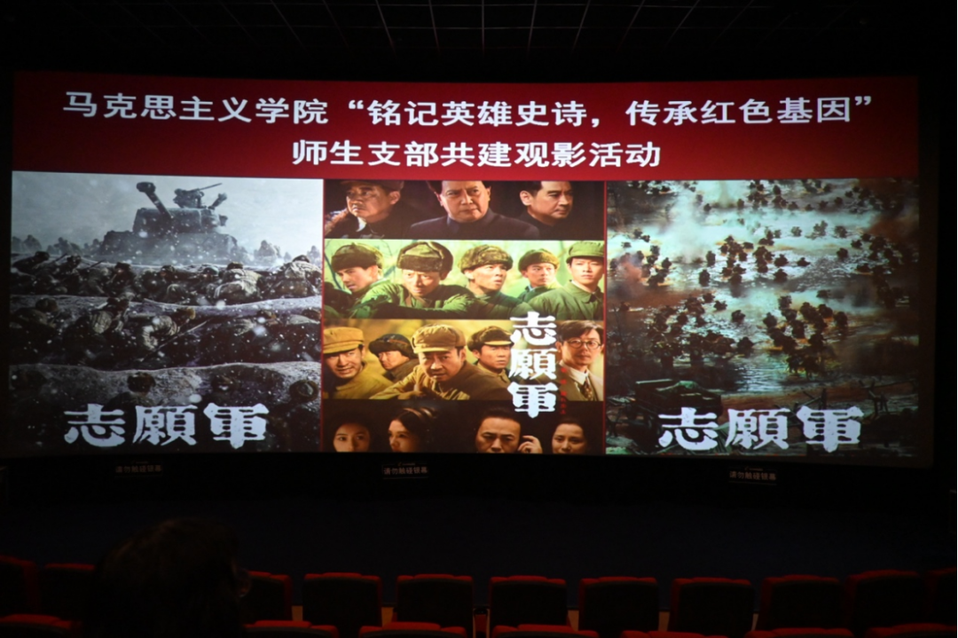 为深入学习贯彻党的二十大精神,深入开展面向广大团员和青年的学习贯彻习近平新时代中国特色社会主义思想主题教育,推动学院党团组织建设融合提升,引领党员、团员传承弘扬好中国共产党人的精神谱系。正值抗美援朝战争胜利70周年之际,马克思主义学院组织于10月17日开展“铭记英雄史诗,传承红色基因”师生党支部共建观影活动。学院教工党支部、本科生党支部、硕士研究生第三、第四党支部全体党员,本科及硕士研究生团支部部分团员共160余人参与本次活动。