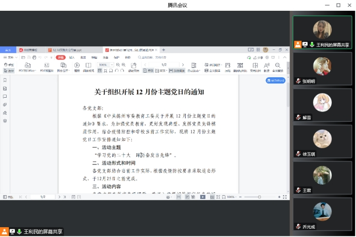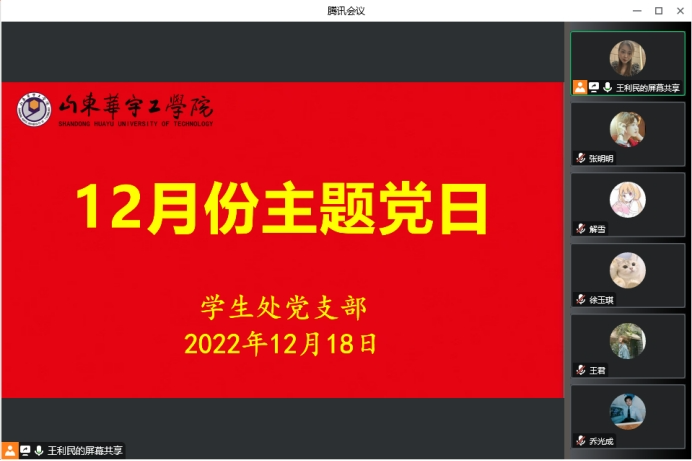 12月18日,学生处党支部召开12月份主题党日,此次会议的主题是“学习党的二十大 踔厉奋发当先锋”。会议由支部书记侯建昌主持,支部全体党员通过线上方式参加了此次主题党日活动。