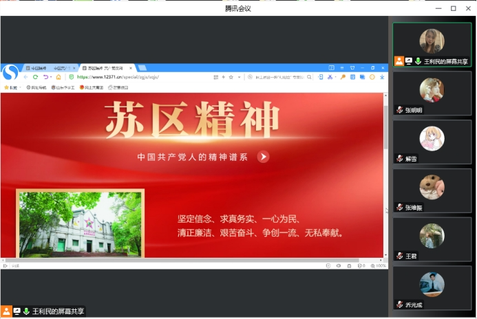 会上,统战委员张明明从习近平总书记在江西考察时的讲话、习近平同志在纪念中央革命根据地创建暨中华苏维埃共和国成立80周年座谈会上的讲话等重要论述出发,从矢志不渝的坚定信念、求真务实的实践探索、一心为民的执政理念、清正廉洁的政治品格、艰苦奋斗的革命精神、争创一流的工作境界、无私奉献的牺牲精神7个方面详细解读了苏区精神。
