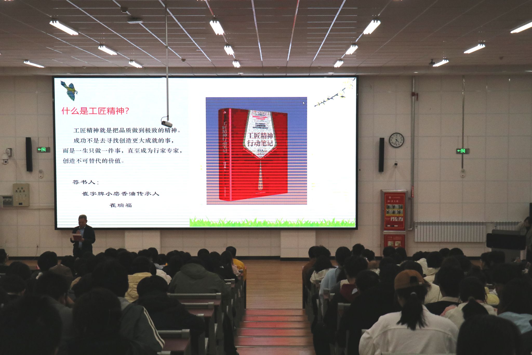 崔瑞福是瑞福油脂股份有限公司董事长、崔字牌小磨香油第二十代传承人、山东省非物质文化遗产代表性传承人,曾荣获山东省劳动模范、山东食品产业优秀企业家等称号。他以《百年工匠 百年瑞福——中华老字号崔字牌的传承创新之路》为题,从传承六百多年前的古法工艺到精专一事、专注一业,大力推行工匠精神、技艺传承等方面和同学们分享了企业的发展历程。他向同学们推荐了《工匠精神行动笔记》,号召同学们要多读书,读好书,树立正确的世界观、人生观、价值观,让自己的人生活出价值、活出意义、活出荣耀。
