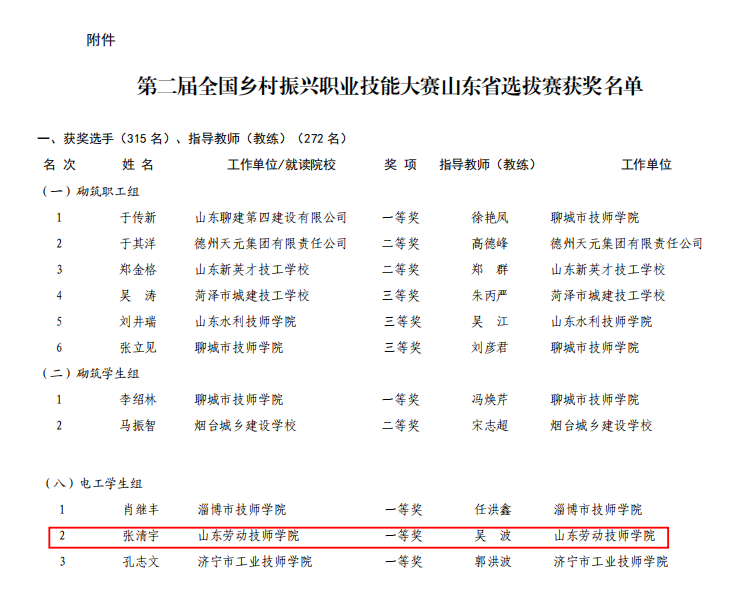 第二届全国乡村振兴职业技能大赛山东省选拔赛是由山东省人力资源和社会保障厅会同山东省农业农村厅主办省级一类大赛,电工赛项由淄博市技师学院承办,来自全省16个地市的60余位参赛选手参加了电工项目。该赛项分为A、B两个模块,A模块为电工线路设计安装,旨在考察选手的设计、安装与调试能力;B模块为PLC、触摸屏、变频器和伺服系统的综合应用。张清宇在吴波老师的悉心指导下,基于日常扎实训练,在比赛中稳定发挥训练水平,获得赛项第2名,获评一等奖。