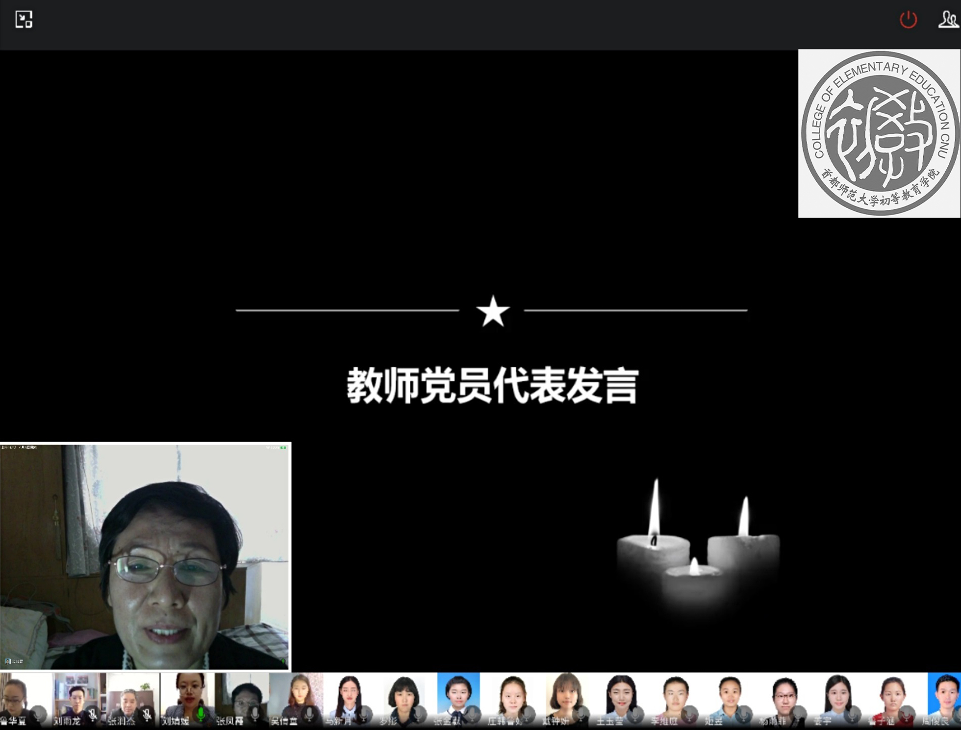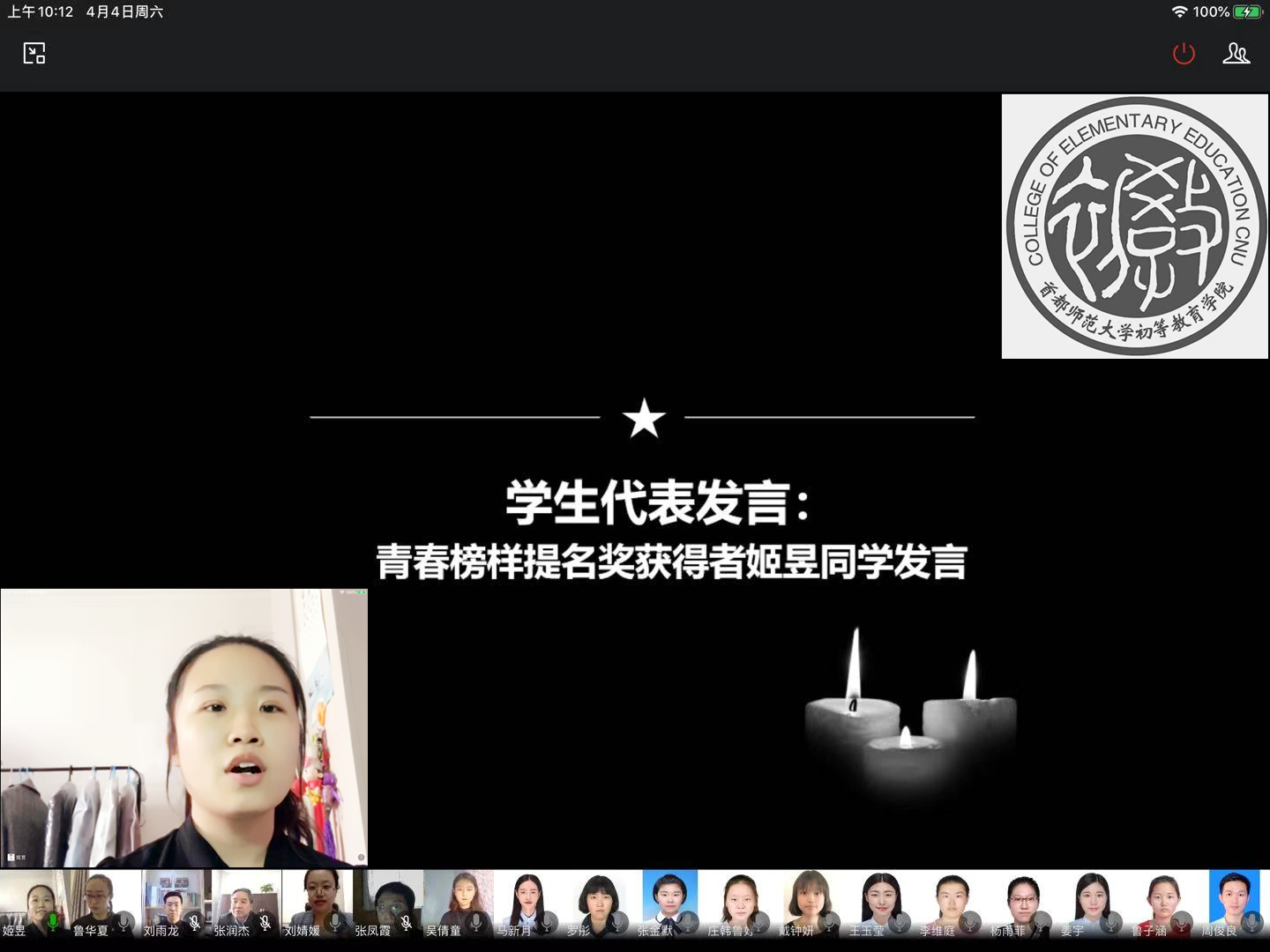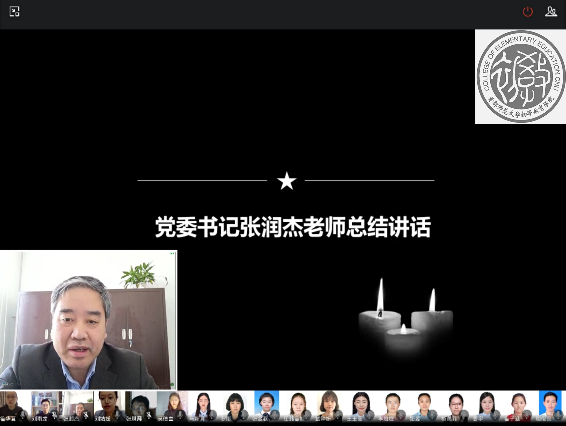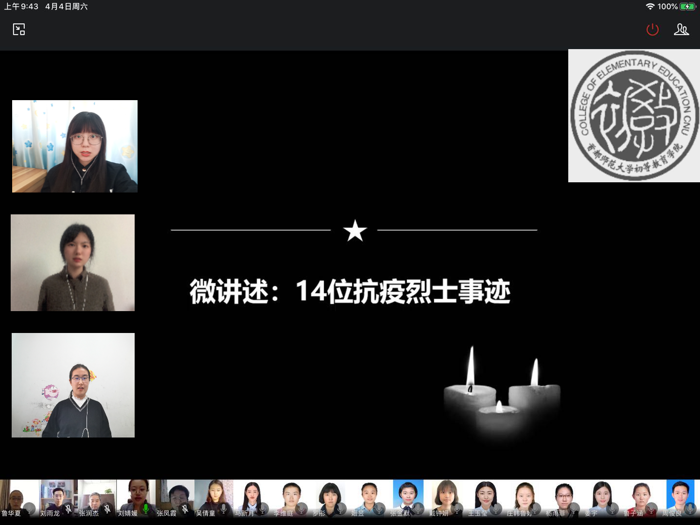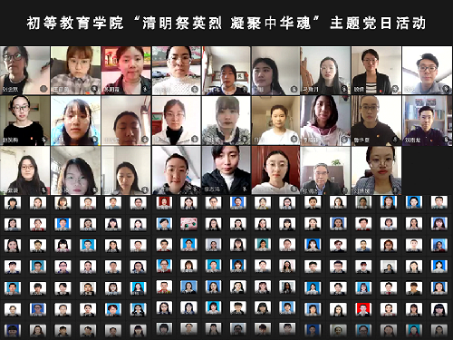 4月4日,初等教育学院在线开展“清明祭英烈,凝聚中华魂”主题党日活动,学生党员通过微讲述、微朗诵、书法展示等形式,学习英烈事迹,激发奋进力量。学院党委书记张润杰、辅导员鲁华夏、韩录、刘雨龙,党员教师张凤霞、曹温庆、崔嵘、国华、李杨、魏戈、张润杰、诸立尚、徐璐、张俊、孙铭明等265名师生党员和入党积极分子参加活动。活动由学院党委副书记刘婧媛主持。