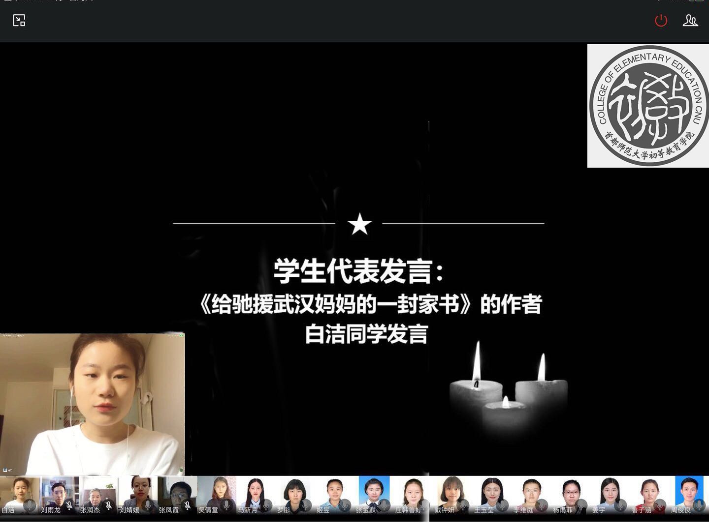 研究生入白洁、青春榜样提名奖获得者姬昱、书法小教员崔佳祎,分别就自己在抗击疫情期间的所思所感分享交流。作为一名驰援武汉医护人员的女儿,白洁同学对妈妈充满了无尽的牵挂,为此她写下一封家书,为妈妈注入强大的精神力量。姬昱、崔佳祎共同讲述了,在防疫期间带领同学们以朗诵和书法等形式抒发援“鄂”之情的事迹,展现了初教学子在疫情防控中的责任担当。