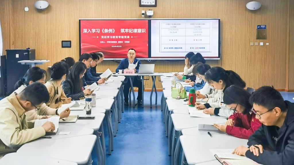 为引导广大党员教师在党纪学习教育中先学一步、学深一层,4月25日,学院党委委员、副院长林艳斌为经济管理系全体党员教师讲授“深入学习《条例》,筑牢纪律意识”党纪学习专题党课。