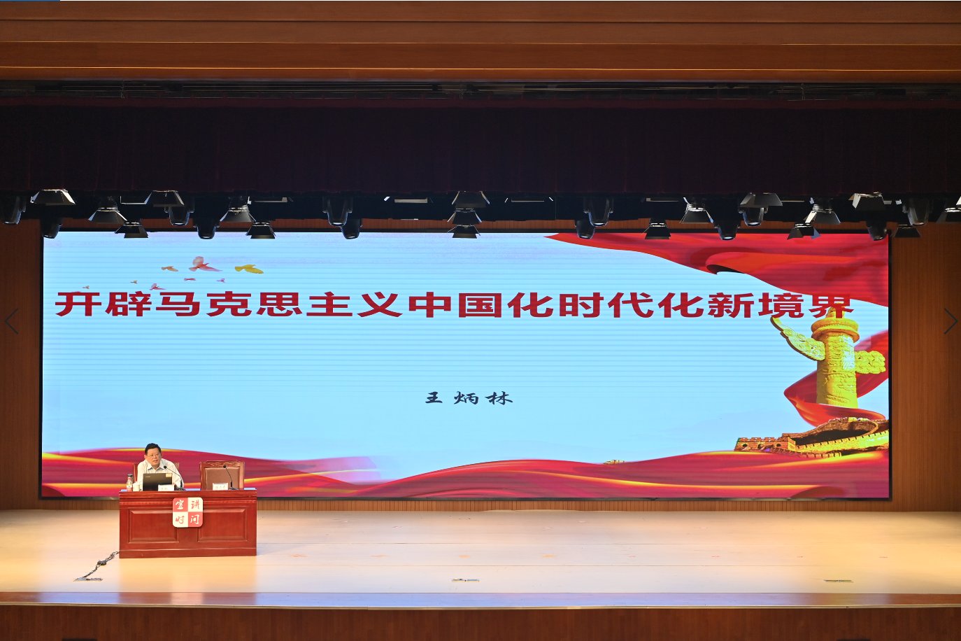王炳林教授以《开辟马克思主义中国化时代化新境界》为题,从“两个结合”是马克思主义中国化时代化的根本要求、习近平新时代中国特色社会主义思想的世界观方法论、习近平新时代中国特色社会主义思想的核心要义等3个方面进行了深入阐释、系统讲授。他指出,习近平新时代中国特色社会主义思想实现了马克思主义中国化时代化新的飞跃,要坚持不懈用这一创新理论武装头脑、指导实践、推动工作。“六个坚持”是习近平新时代中国特色社会主义思想的精髓,是开辟马克思主义中国化时代化新境界的根本要求,必须一以贯之。深入开展学习贯彻习近平新时代中国特色社会主义思想主题教育,要全面系统深入把握这一思想的核心要义、精神实质、丰富内涵、实践要求,不断增进政治认同、思想认同、理论认同、情感认同,努力做到以学铸魂、以学增智、以学正风、以学促干。