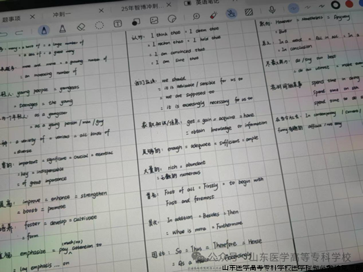 宿舍六人自入学以来,始终秉持“学习是第一要务”的理念,形成了浓厚的学习氛围。“语文小能手”闫冠童、“高数达人”杨金凤、“英语双姝”卓艳贞与王馨梓、“专业课王牌”马舒晴和赵振琰——这个神奇的宿舍组合,用学科互补构建起独特的学习生态圈。在校期间六人一起讨论复习专业课内容,最终全员取得专升本校荐生资格。专升本备考期间彼此虽不能见面,但也常常在线上分享自己的笔记,笔记本上密密麻麻的批注见证着她们共同进步的足迹。