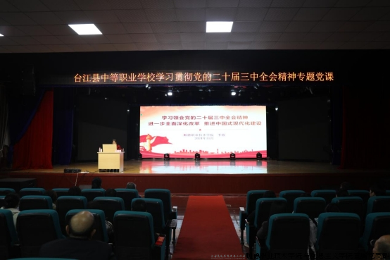 16:30,顺德职院马克思主义学院直属党支部书记李霞教授在我校行政楼3楼演播厅为全体教师、部分学生作《学习贯彻党的二十届三中全会精神》专题党课。党课由台江职校纪委书记刘德良主持。李霞书记从“关键时期”、“鲜明主题”、“重大成果”三个方面,深刻阐述了党的二十届三中全会的重要意义。她强调,教师要充分认识深化教育综合改革的重大意义,坚持“培养时代新人、服务高质量发展、办好人民满意教育”的重点改革方向,推动教育改革与发展,为职业教育的发展贡献自己的力量。