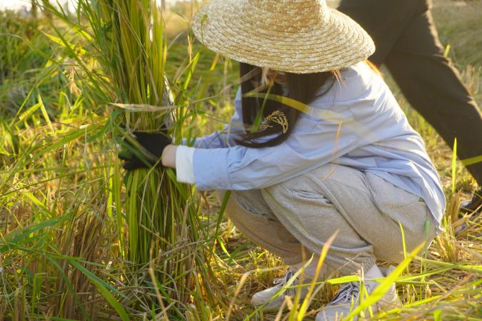 上财法学会党支部一行到达青浦区金泽镇的农庄后,全体同志在工作人员的指导下,学习了关于收割的基本知识。据工作人员介绍,收割稻谷是一种传统而古老的农作方式,是农人的一项基本技能,看似简单,但也讲究技巧方法。首先,需要反方向抓住稻谷,其次用镰刀从根部进行收割,最后在堆放的时候,还需要将稻谷整齐摞好,避免参差。在收割完成之后,党员们还在当地农民的带领下,将稻谷捆扎成束,并使用土法打谷。