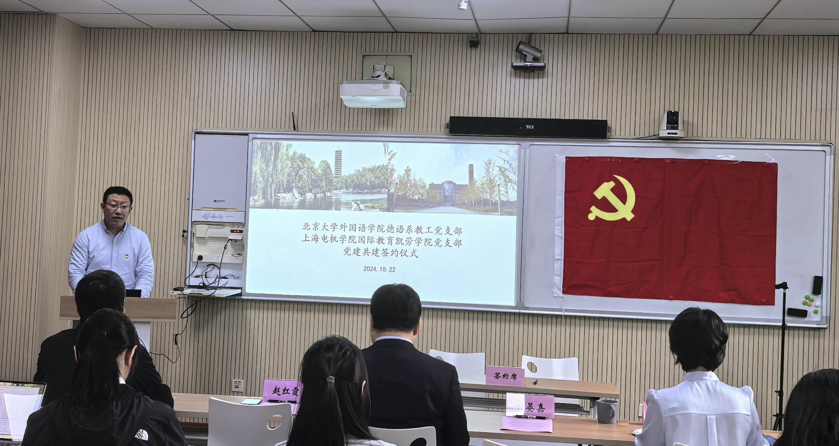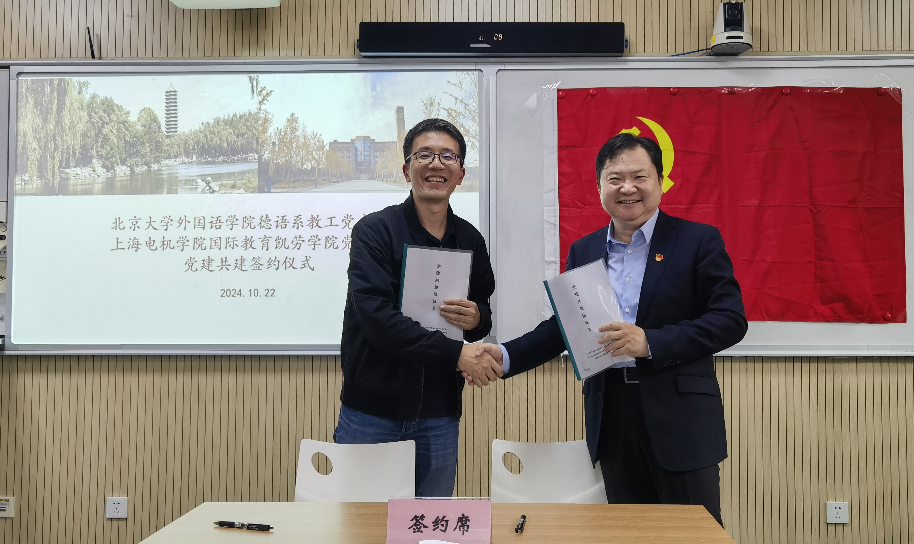 10月22日,国际教育党总支凯劳学院党支部与北京大学外国语学院德语系教工党支部结对共建签约仪式在中德212举行。北大外院教工党支部书记、博士生导师马剑教授与凯劳学院党支部书记柯磊作为同时入选2024年全国高校“双带头人”教师党支部书记“强国行”专项行动团队的两个党支部代表签约。上海电机学院组织部副部长田晏嘉、国际教育党总支书记何宁、凯劳学院副院长邵兵以及凯劳学院党支部全体党员共同见证了签约。签约仪式由国际教育党总副书记赵红霞主持。