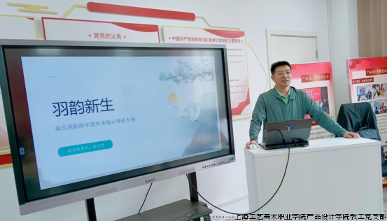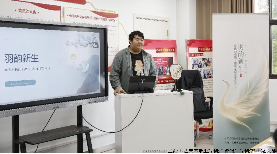 活动伊始,宁阳县职业中专“羽韵新生”学生创业团队代表赵文杰同学呈现了精彩的报告。他深入介绍了秦式羽粘画的非遗特色并提出了项目团队的创业理想,期望借助上海工艺美术职业学院在文创设计领域的深厚功底,探索“设计在工美,制作在乡村,销往全世界” 的共赢合作商业模式。通过这一模式,推动秦式羽粘画的传承与发展,带动乡村经济繁荣,提高审美趣味,使非遗技艺在新时代重焕生机。