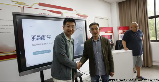 2025年6月13日上午,宁阳县职业中等专业学校 “羽韵新生” 创业团队走进上海工艺美术职业学院,举办了一场精彩的秦式羽粘画非遗传承展示体验活动。产品学院副院长教工支部书记王华杰、产品设计专业课教师及学生齐聚一堂,共同领略传统非遗技艺的独特魅力。