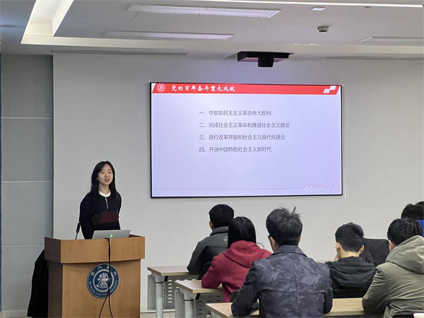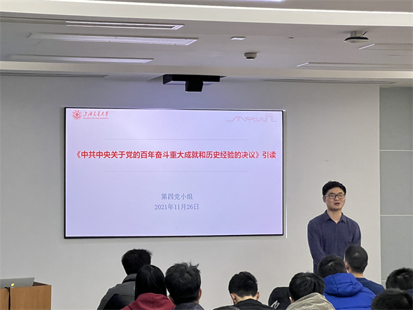 首先,第四党小组赖平等7位同志以情景剧的形式,引读了在党的十九届六中全会中通过的《中共中央关于党的百年奋斗重大成就和历史经验的决议》。为了回顾党的百年奋斗重大成就,秦源辰、郑嘉威、徐子伊、温越盈、吴雨乐、潘晓晗6位同志分别从萨镇冰、许德珩、西藏农奴、安徽女大学生等不同人物的视角,用以小见大的方式还原了新民主主义革命、社会主义革命、改革开放和中国特色社会主义新时代时期,党和国家发生的天翻地覆的变化。最后,赖平归纳了决议里中国共产党百年奋斗的历史意义和历史经验,强调党的百年征程实际上就是一场“赶考”,时代是出卷人,我们是答卷人,人民是出卷人;他勉励大家,作为新时代青年,要牢记“一代人有一代人的使命,一代人有一代人的担当”,为实现中华民族伟大复兴的中国梦儿不懈奋斗。