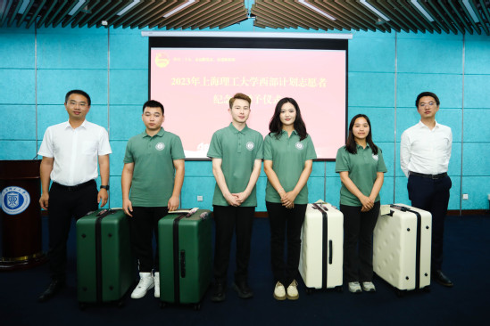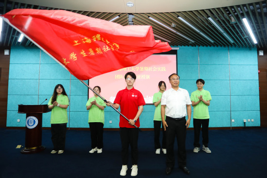 党委研工部部长彭宗祥向暑期社会实践团队代表授旗。上海市希望工程和青年志愿指导中心副主任陈刘栋、党委组织部副部长孟志雷为西部志愿者发放学校纪念品。
