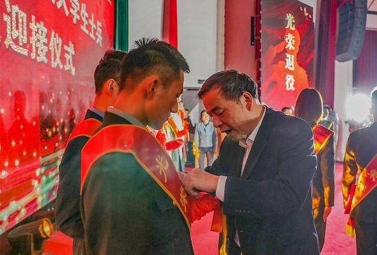 与会领导为退役大学生士兵佩戴光荣花。他们对载誉而归的退役大学生表示热烈欢迎,肯定了退役大学生应征入伍的豪情,赞扬了同学们从军期间的优异表现,表达了学校对同学们的关心和挂念。