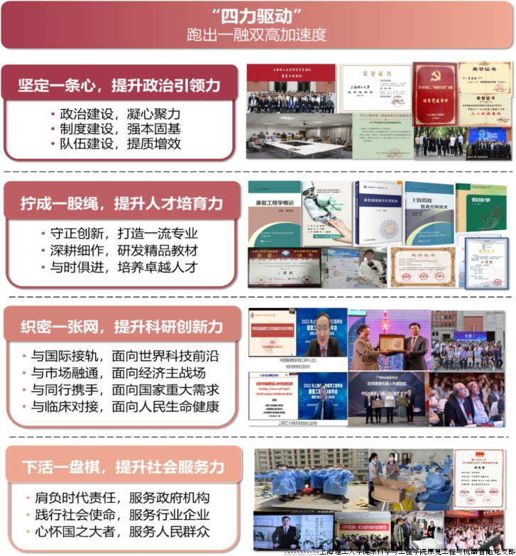 康复工程与机器智能党支部始终秉持以党建为引领,提出“一三四七”工作思路,即围绕“一个中心”立德树人总航标,立足于上海市劳模工作室、民政部重点实验室与上海市工程技术中心“三个平台”,推进党建工作与业务发展深度融合,形成政治引领力、人才培育力、科研创新力和社会服务力提升的“四力驱动”局面,夯实党建基础,坚守育才初心,倡导服务奉献,创建党建品牌,对标争先,切实做到“七个有力”,在全力构建新发展格局、推进高质量发展的新征程上踔厉奋发、赓续前行。