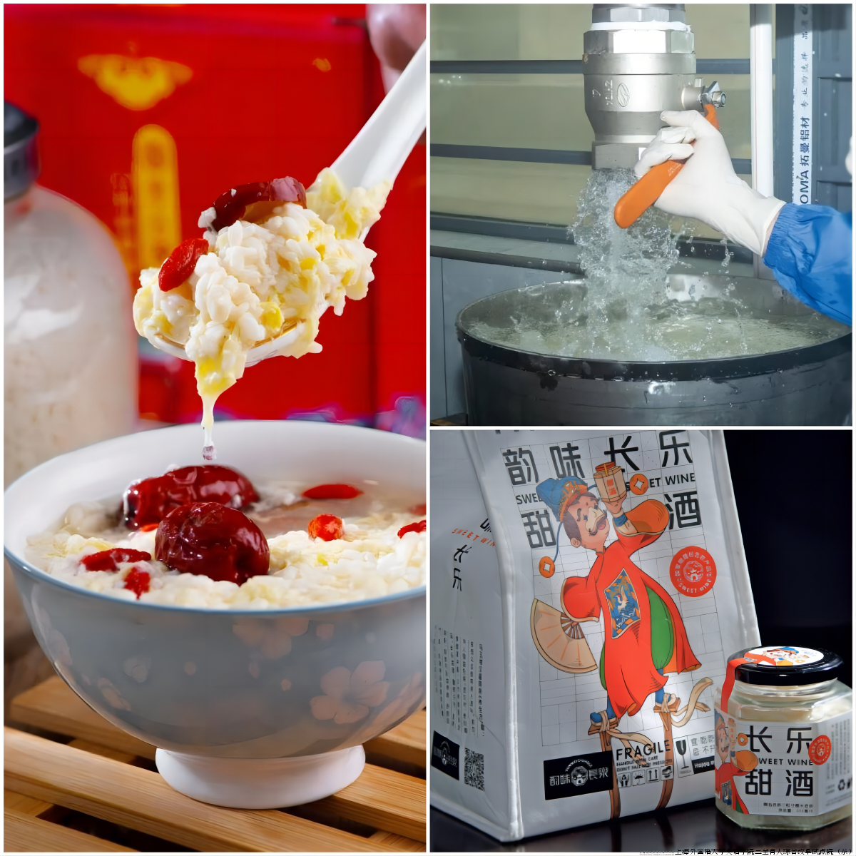 随着科技进步,长乐甜酒传统的酿造工艺与现代技术进行融合。(With the advancement of technology, traditional brewing techniques have been integrated with modern technology.) 在高温高压蒸汽的作用下,蒸饭时长大大缩减。解淘(将刚蒸好的糯米过冷水,降低糯米粘性)的过程也做到了机械自动化。蒸好的糯米经恒定水量的纯净水快速冲洗,2分钟后,糯米解淘完全,粒粒分明。配备15个单元的发酵隧道中可以做恒温单瓶独立发酵,日产甜酒15吨。这些先进科技保障了长乐甜酒的产量稳定、品质优越。