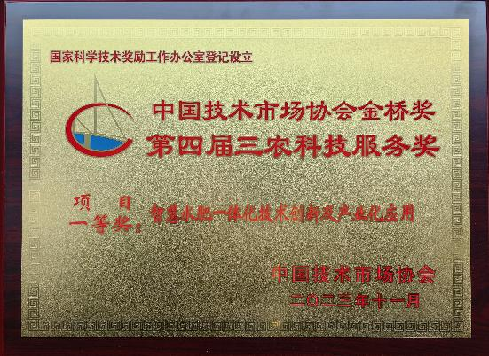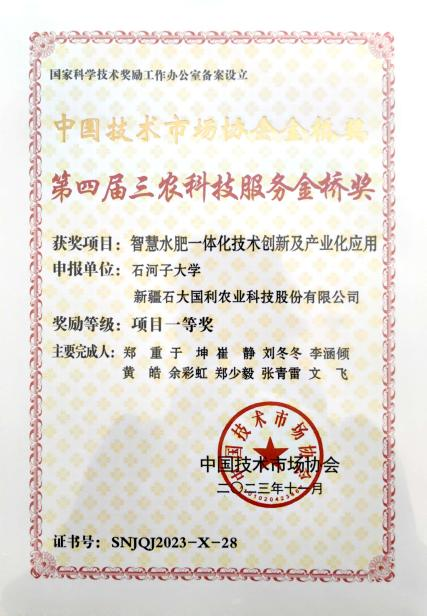 第四届三农科技服务金桥奖颁奖典礼在北京隆重举行。由石河子大学农学院“智慧水肥一体化技术创新及产业化应用”项目荣获一等奖。