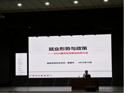 为提高毕业生职业意识,开拓学生就业视角,2023年10月8日,邮政系于本部礼堂召开2024届毕业生就业动员暨就业形势与政策教育大会。大会由邮政系党总支书记崔春华主讲,2024届全体毕业生到场聆听。会上,主要从邮政集团公司简介、当前就业形势分析、就业准备及注意事项三方面进行介绍。结合当前就业形势分析,提醒毕业生要注重知识储备,积极提升自身能力,学会吃苦,积极做好基层工作。