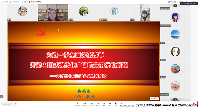 3月28日下午,整合医学中心党支部携手北京化工大学机电工程学院塑机所党支部、北京大学第三医院疼痛科党支部等9个党支部,共同开展了支部共建共学主题教育活动。本次活动聚焦深入学习贯彻党的二十届三中全会精神,邀请辽宁省党校冉鸿燕老师担任主讲,旨在加强各党支部间的交流合作,提升党员理论素养,推动党建工作与实际业务深度融合。
