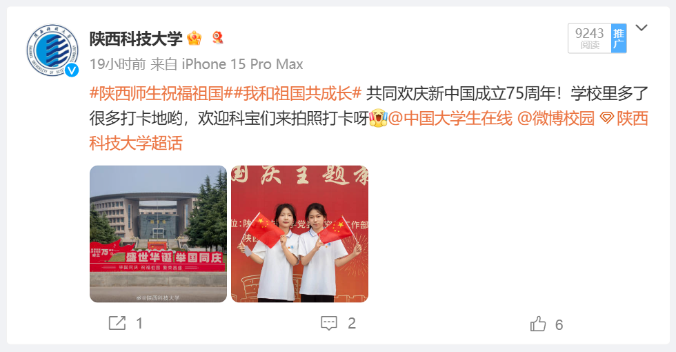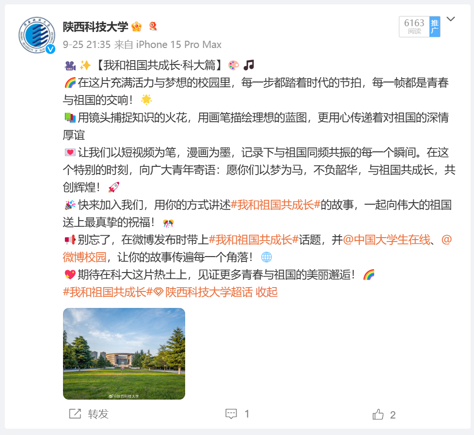 在这个意义非凡的时刻,我们通过微博平台发起征集活动,汇聚了来自五湖四海的祝福与心声。“我和祖国共成长”活动不仅是对新中国75华诞的深情献礼,更是展现了新时代青年学子的爱国情怀与责任担当。让我们携手并进,在新时代的征程中,继续书写属于中华民族的辉煌篇章!