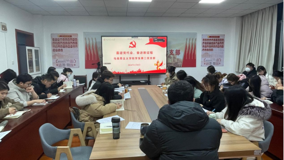 为深入学习贯彻习近平新时代中国特色社会主义思想和党的二十大精神,迎接学校第二次党代会胜利召开,激励马克思主义学院全体党员统一思想、凝心聚力、砥砺前行,2024年1月8日晚,马克思主义学院学生第二党支部在党员活动室召开“喜迎党代会,奋进新征程”主题党日活动。会议由马克思主义学院学生第二党支部书记杨国鹏同志主持,支部全体党员、发展对象及积极分子参加会议。