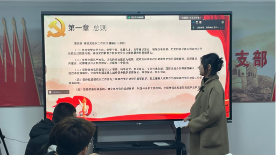 党荷静同志带领大家学习《中国共产党普通高等学校基层组织工作条例》,通过学习《条例》中的总则、组织设置、主要职责、党的纪律检查工作、党员队伍建设、干部和人才工作、思想政治工作、对群团组织的领导、领导和保障以及附则这十个大方向,大家深入了解《条例》的重要意义以及明确在之后的学习生活和工作中该如何去做。