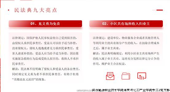 “乘坐高铁霸座、游戏账号被盗、校园贷纠纷……这些生活中的常见问题,民法典都有明确解答。”讲解中以“民法典与生活同行”为切入点,通过“婚姻家庭”“校园安全”“网络消费”等师生关心的场景,列举了多个典型案例。