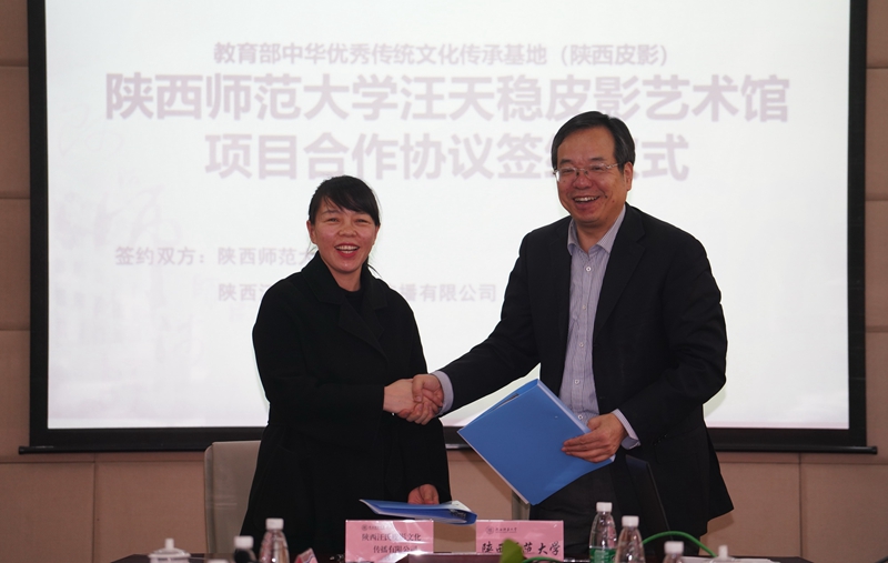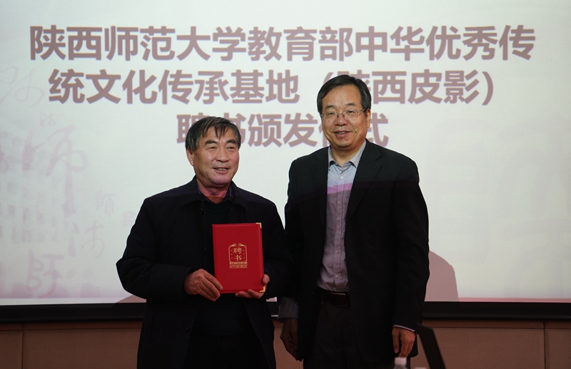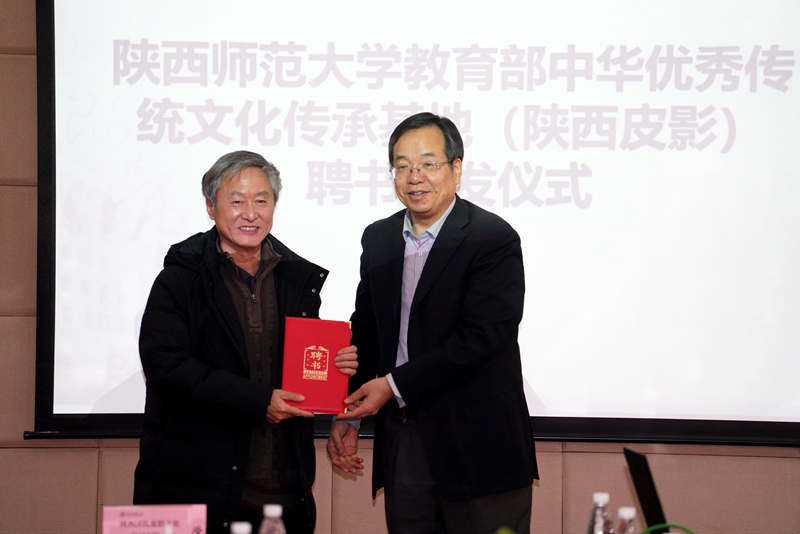 党怀兴与马晓云共同为“皮影传承基地”揭牌,党怀兴与陕西汪氏皮影文化传播有限公司法人代表汪海燕签署了关于在我校设立“汪天稳皮影艺术馆”的合作协议,同时向汪天稳颁发了“皮影传承基地”客座教授聘书,向修建桥颁发了“皮影传承基地”特聘专家聘书,向汪天喜、魏金全、汪海燕、赵百平、孙卫、孙赞颁发了“皮影传承基地”传习导师聘书。汪天稳、修建桥、魏金全、孙卫等代表受聘人员作了表态发言。