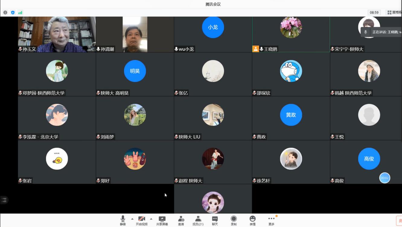 2020年12月20日,“陕西师范大学·北京大学第五届《史记》研究论坛”通过腾讯会议平台举行(会议号:452349178)。北京大学中文系孙玉文教授、我院党委书记孙清潮、副院长王晓鹃教授、黄政副教授、邵琛欣老师、两校的15位同学代表及部分专业学生参加了论坛。论坛由王晓鹃教授主持。