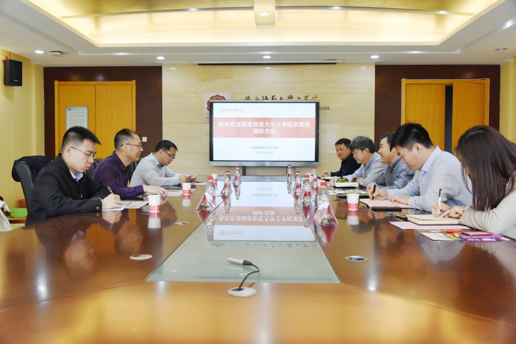 闫文杰首先代表学院对福建师大文学院的来访表示热烈欢迎,并感谢福建师大文学院对我院中文学科长期以来的关心与支持,接着,闫文杰简要介绍了学院发展历史、专业建设、科研平台、师资队伍、人才培养等方面的情况。苏仲乐重点说明了我院近年来在学科建设方面取得的成绩与今后努力的方向。李小荣结合福建师大文学院的发展历史与中文学科的相关情况,分享了在人才引进、平台建设、专业建设及社会服务方面的经验,他表示,两校之间渊源颇深、情谊深厚,希望双方继续保持良好的合作关系。