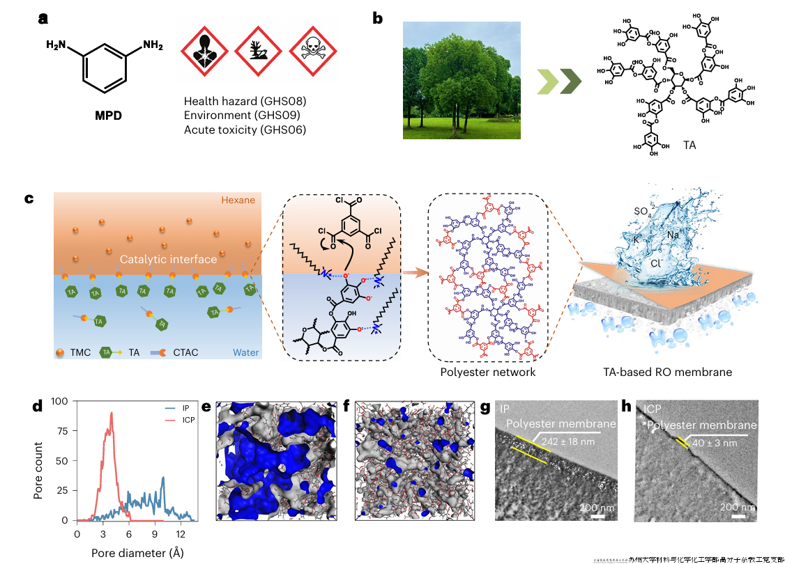 此项研究首要创新点在于用单宁酸(TA,一种可从植物中广泛提取的酚类物质)取代传统有毒的间苯二胺(MPD)来制备反渗透膜材料。与MPD单体相比,单宁酸的反应活性较低,无法通过传统的界面聚合形成致密、无缺陷的脱盐层。为了克服传统反渗膜制备过程中由于MPD单体毒性所带来的一系列安全和环境风险,靳健教授团队创新性地提出了界面催化聚合,大幅提升天然多酚类化合物或多羟基化合物在界面聚合反应过程中的活性,成功制备出脱盐性能可以媲美商用苦咸水脱盐用反渗透膜材料。研究团队在水相溶液中引入了十六烷基三甲基氯化铵(CTAC)。CTAC分子中季铵盐基团通过其Lewis酸性质有效催化酚羟基与酰氯之间的反应。同时CTAC兼具表面活性,使得TA在界面局部富集。通过CTAC的表面活性和催化作用,最终形成平滑且高交联度的聚酯反渗透膜。通过分子动力学模拟(MD)以及中性分子截留测试,显示界面催化聚合(ICP)制备聚酯反渗透膜其平均孔径约4 Å,远小于传统界面聚合制备的聚酯分离膜(平均孔径~10 Å)。此外,通过ICP方法制备的聚酯反渗透膜表面光滑平整,具有十分优异的抗污染性能。在循环过滤过程中,经简单的纯水清洗即可实现膜表面的污染物的去除和膜面的再生,膜通量恢复率达到97%。与此相比,传统的聚酰胺反渗透通量恢复率不到40%。
