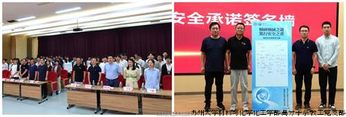 安全宣誓环节,在姚诗琦同学的领读下,全场师生共同宣读了“新时代材化人安全誓词”。随后,学部党委书记陆岸、副主任徐小平、高分子系教工党支部书记何金林、研究生高分子1党支部书记王亦陈共同签署安全承诺签名墙。这一举动将责任具象化,让承诺不仅留在誓词中,更落在纸上、铭于心中,成为每位师生共同遵守的安全准则。