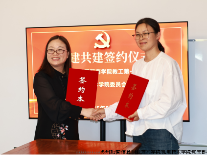 苏州托普信息职业技术学院机电技术学院党支部与苏州高博职业学院国际商学院教工第一党支部举办共建签约仪式,托普学院机电技术学院支部书记浦玉香与苏州高博职业学院国际商学院教工第一党支部牛伟,代表双方党支部签订《党建共建协议》,共商支部发展对策。
