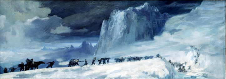 这件作品应该说是革命历史题材创作中的一幅经典,作品左侧的云端好像是凝固在天空中,和右边的暴风雪在构图上正好起到一个回应的作用。用远处的乌云衬托近景的冰坡,冰坡的处理上用灰色或冷灰色、暖灰色这样一些色彩的变化,来调整整个画面的色彩的构成,一气呵成。