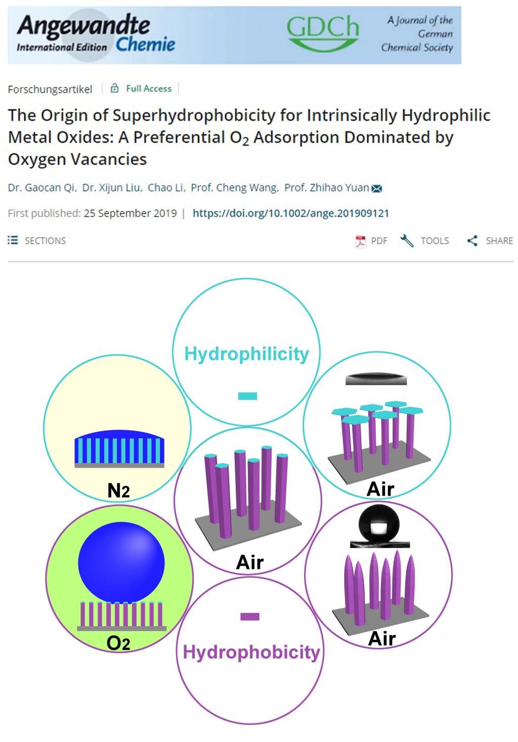 近日,我校材料学院袁志好教授团队针对亲水材料的超疏水机制研究取得重要进展。该研究团队使用多种具有结构代表性的亲水性氧化物为模型材料,巧妙地设计并研究了气氛环境与处理方式对材料表面状态以及超疏水性能的影响。结合密度泛函理论计算指出,氧空位的存在使得内在亲水材料表面对氧气分子的吸附能力大于对水分子的吸附。在此基础上,通过对由亲水材料构建粗糙结构的表面缺陷与表面润湿性的深入研究分析,提出了亲水氧化物材料的超疏水行为起源于表面氧空位诱导的氧气偏爱吸附,而不是通常认为的“束缚空气层”机制。该研究成果以题为“The origin of superhydrophobicity for intrinsically hydrophilic metal oxides: A preferential O2-adsorption dominated by oxygen vacancy”发表在专业领域顶级期刊Angew. Chem. Int. Ed. (DOI: 10.1002/anie.201909121; 全文链接:https://onlinelibrary.wiley.com/doi/10.1002/anie.201909121)上。