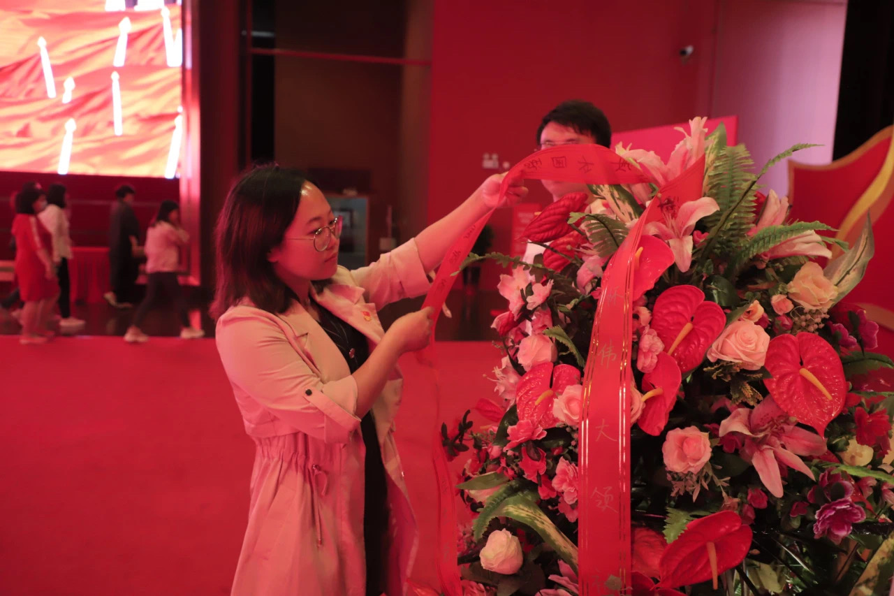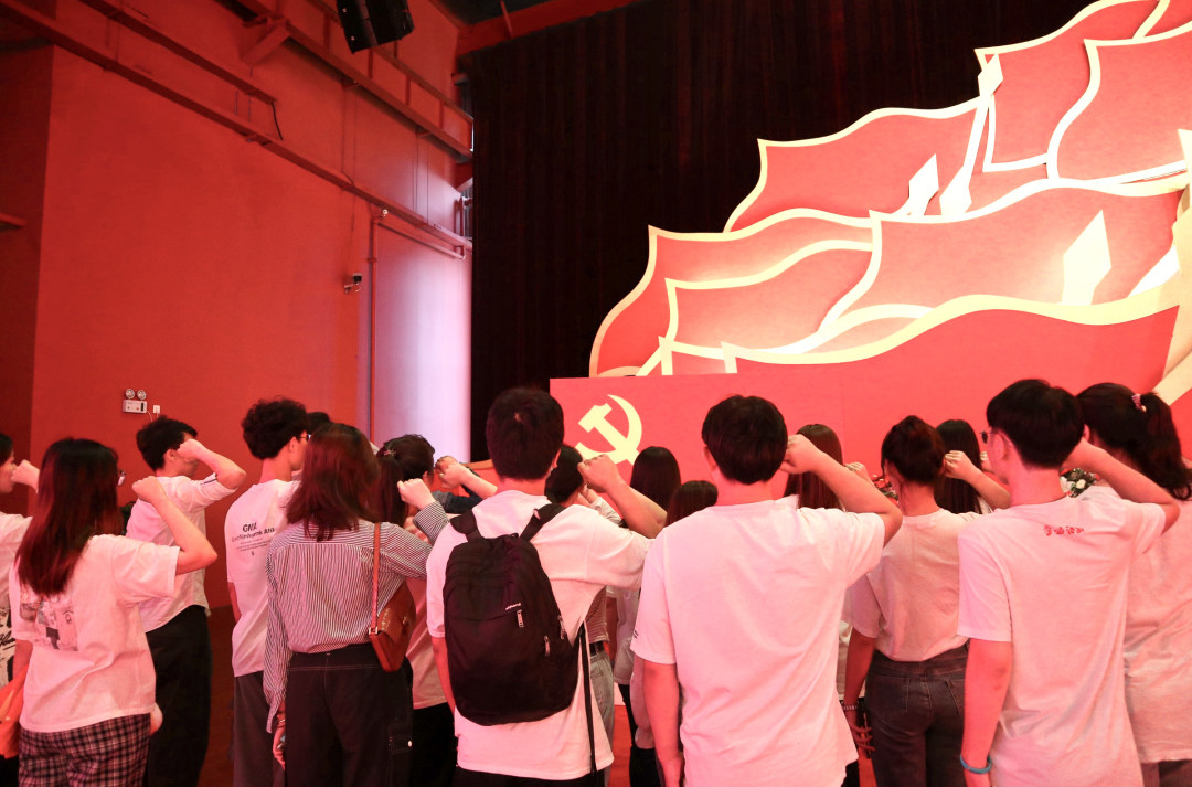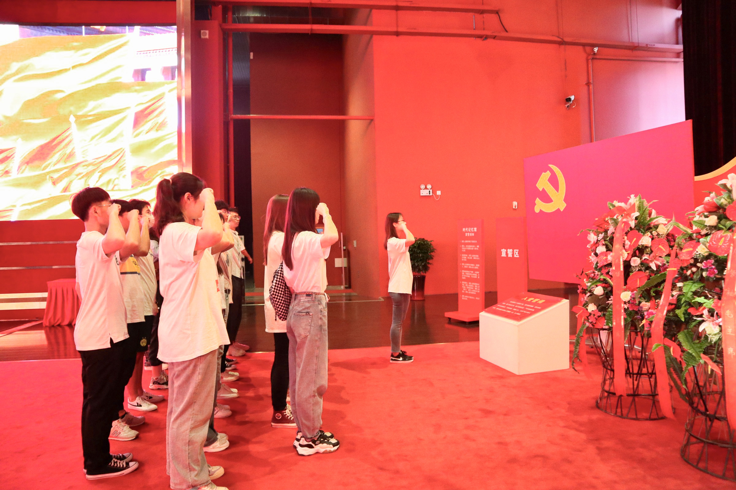 在时空殿堂的尽头,党支部代表为毛主席敬献花篮,全体党员在张鑫烨同志的带领下庄严宣誓,重温入党誓词。