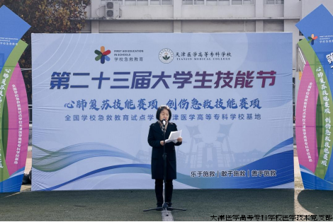 学校党委副书记、副校长左红同志出席大赛现场并致辞。她指出,学校党委始终高度重视学生职业技能和职业精神培养。技能节作为我校深化实践育人、文化育人的重要载体已举办二十二届。自 2020 年起,为精准对接健康天津建设战略部署,主动响应公众健康事业发展需求,学校针对心肺复苏、头部包扎等急救技能面向全体在校生开展培训、竞赛,年均不少于4000名学生受益。活动已逐步成长为兼具行业影响力、校园凝聚力与社会服务力的卫生职业教育特色品牌。她强调,学校始终将学生职业技能淬炼与职业精神培育置于办学治校核心位置,希望全体学子要牢记习近平总书记“立大志、明大德、成大才、担大任”的殷切嘱托,坚持德技并修,把个人理想追求融入实现中华民族伟大复兴的奋斗历程。
